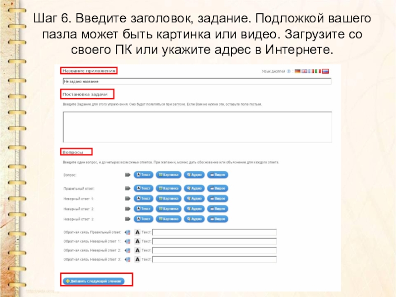 Шаг 6. Введите заголовок, задание. Подложкой вашего пазла может быть картинка или видео. Загрузите со своего ПК