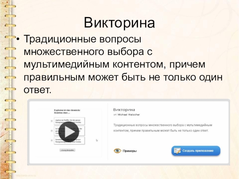 ВикторинаТрадиционные вопросы множественного выбора с мультимедийным контентом, причем правильным может быть не только один ответ.