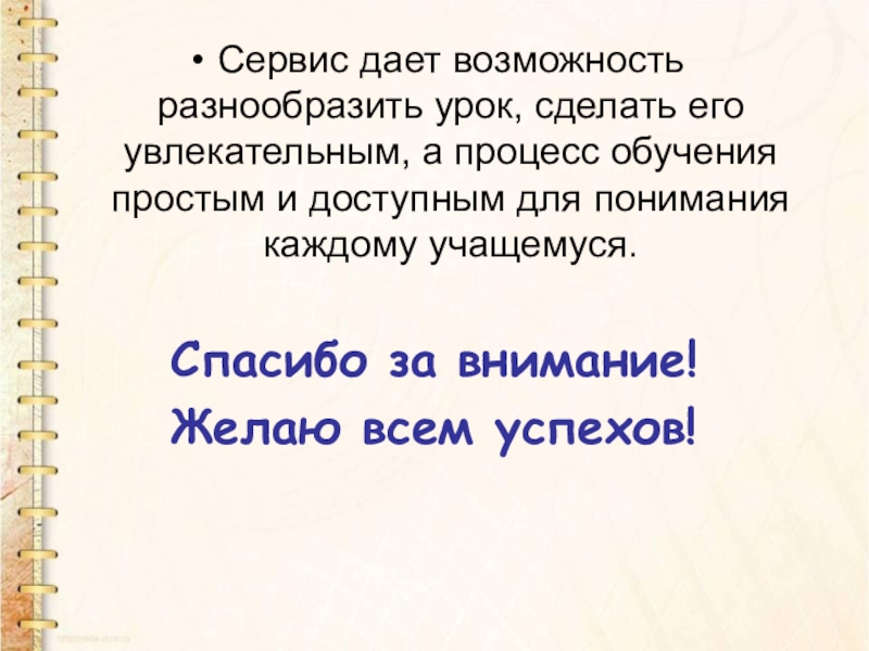 Слайд 30Сервис дает возможность разнообразить урок, сделать его увлекательным, а процесс обучения