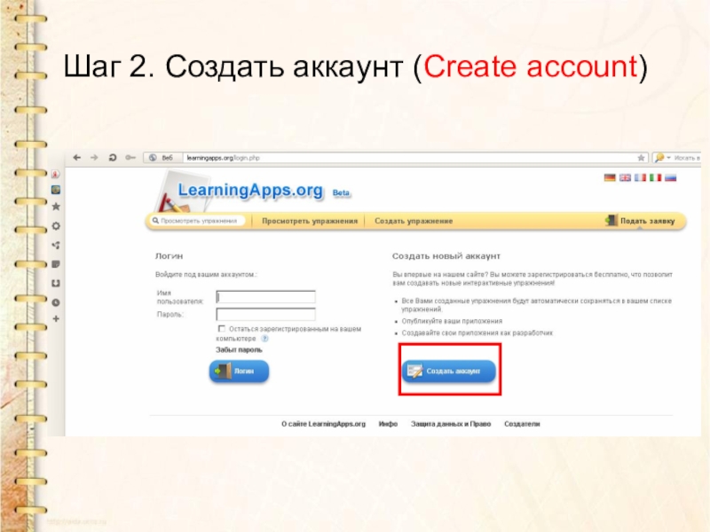 Слайд 4Шаг 2. Создать аккаунт (Create account)
