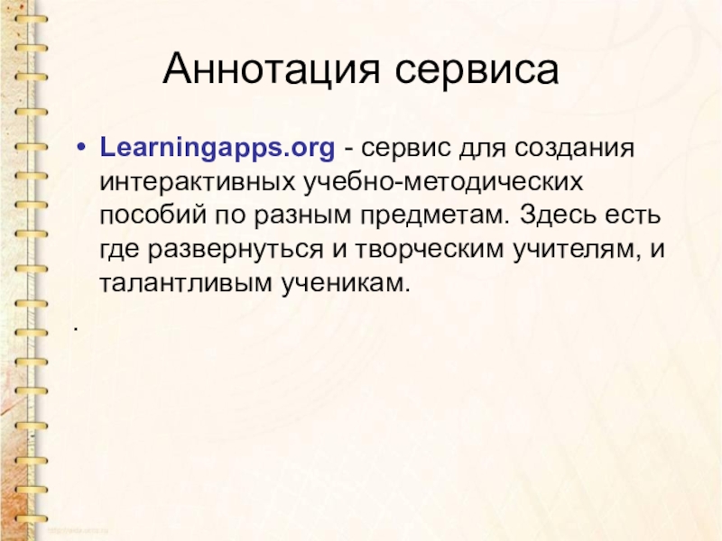 Аннотация сервисаLearningapps.org - сервис для создания интерактивных учебно-методических пособий по разным предметам. Здесь есть где развернуться и