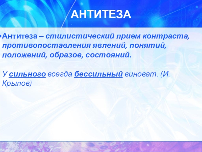 Антитеза – стилистический прием контраста, противопоставления явлений, понятий, положений, образов, состояний.