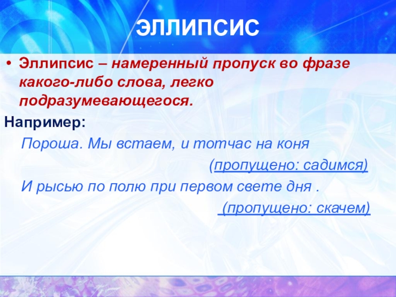 Эллипсис – намеренный пропуск во фразе какого-либо слова, легко подразумевающегося.