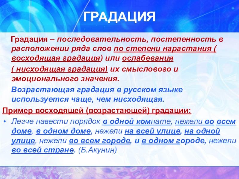 Возрастающая градация в русском языке используется чаще, чем нисходящая.