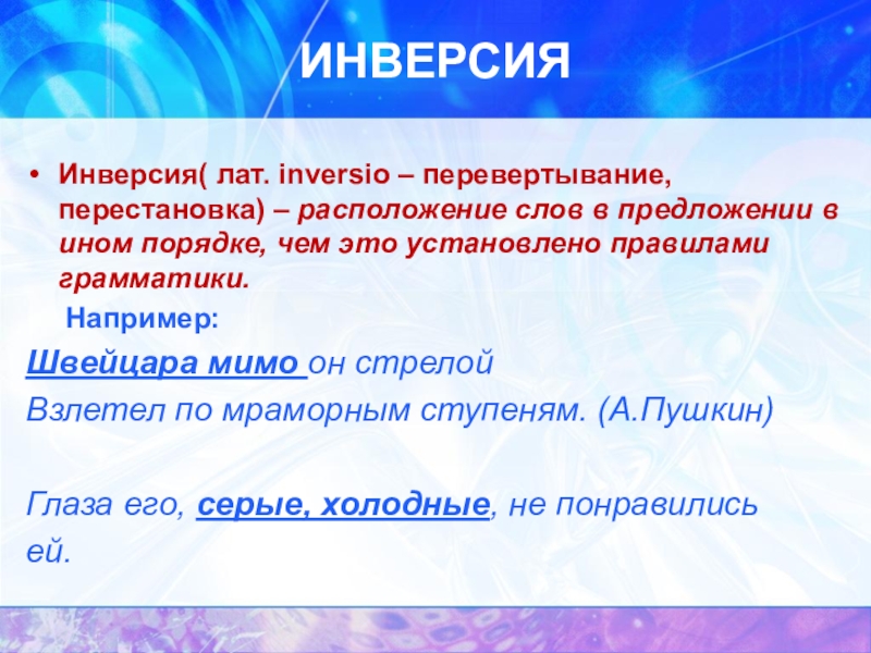Инверсия( лат. inversio – перевертывание, перестановка) – расположение слов в предложении