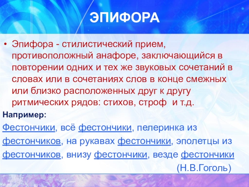 Эпифора - стилистический прием, противоположный анафоре, заключающийся в повторении одних и