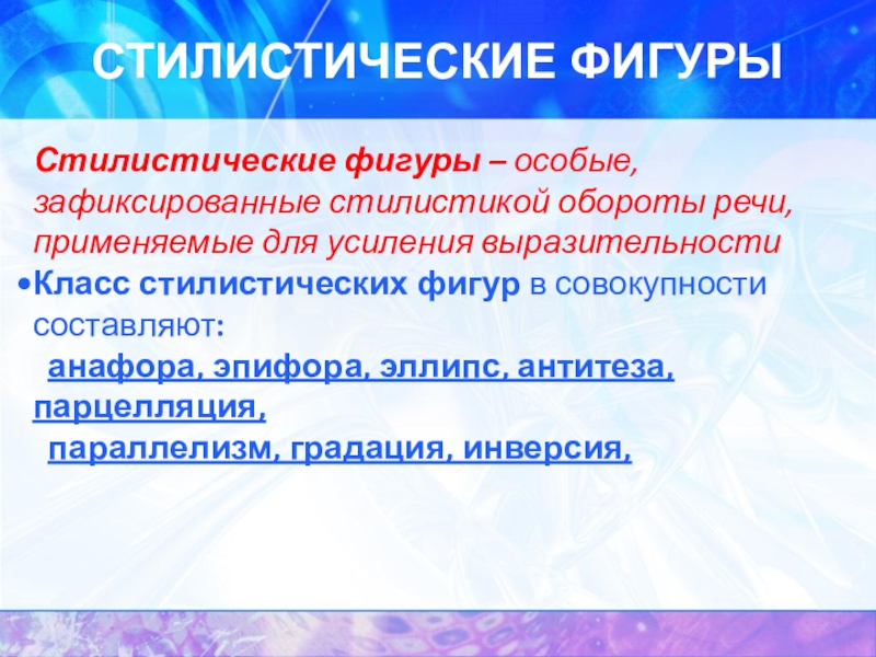 Стилистические фигуры – особые, зафиксированные стилистикой обороты речи, применяемые для