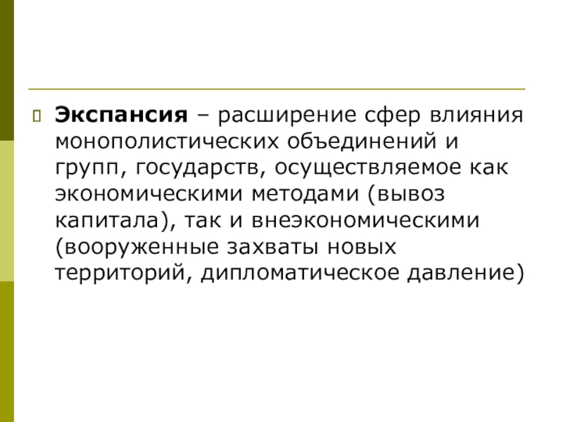 Экспансия – расширение сфер влияния монополистических объединений и групп, государств, осуществляемое
