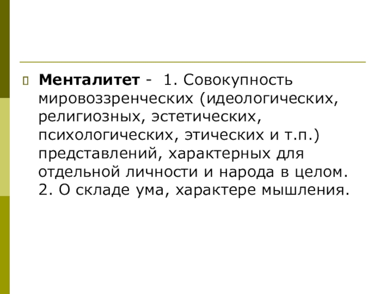 Менталитет - 1. Совокупность мировоззренческих (идеологических,религиозных, эстетических, психологических, этических и т.п.)