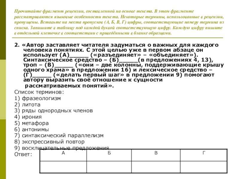 языковые особенности текста. Некоторые термины, использованные в рецензии, пропущены. Вставьте на места пропусков (А, Б, В, Г) цифры, соответствующие номеру термина из списка. Запишите в таблицу под каждой буквой соответствующую цифру. Каждую цифру пишите в отдельной клеточке в соответствии с приведёнными в бланке образцами.