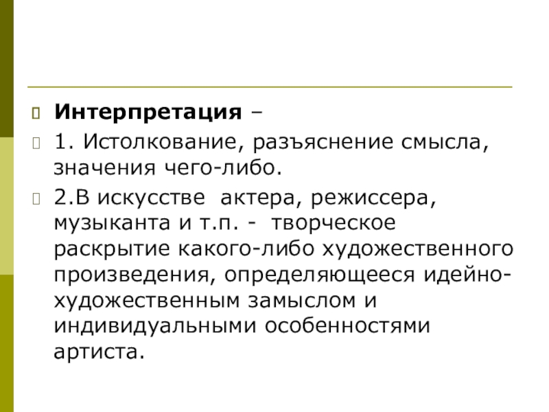 режиссера, музыканта и т.п. - творческое раскрытие какого-либо художественного произведения, определяющееся идейно-художественным замыслом и индивидуальными особенностями артиста.