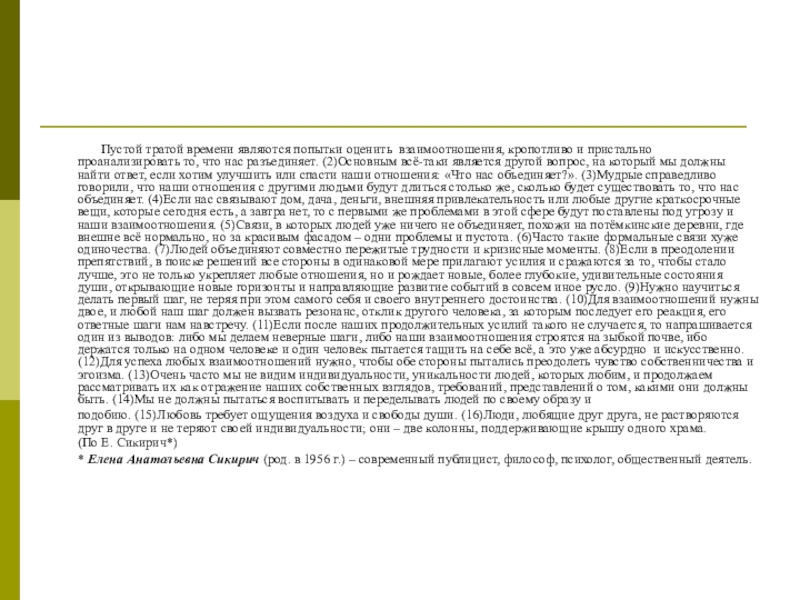 являются попытки оценить взаимоотношения, кропотливо и пристально проанализировать то, что нас разъединяет. (2)Основным всё-таки является другой вопрос, на который мы должны найти ответ, если хотим улучшить или спасти наши отношения: «Что нас объединяет?». (3)Мудрые справедливо говорили, что наши отношения с другими людьми будут длиться столько же, сколько будет существовать то, что нас объединяет. (4)Если нас связывают дом, дача, деньги, внешняя привлекательность или любые другие краткосрочные вещи, которые сегодня есть, а завтра нет, то с первыми же проблемами в этой сфере будут поставлены под угрозу и наши взаимоотношения. (5)Связи, в которых людей уже ничего не объединяет, похожи на потёмкинские деревни, где внешне всё нормально, но за красивым фасадом – одни проблемы и пустота. (6)Часто такие формальные связи хуже одиночества. (7)Людей объединяют совместно пережитые трудности и кризисные моменты. (8)Если в преодолении препятствий, в поиске решений все стороны в одинаковой мере прилагают усилия и сражаются за то, чтобы стало лучше, это не только укрепляет любые отношения, но и рождает новые, более глубокие, удивительные состояния души, открывающие новые горизонты и направляющие развитие событий в совсем иное русло. (9)Нужно научиться делать первый шаг, не теряя при этом самого себя и своего внутреннего достоинства. (10)Для взаимоотношений нужны двое, и любой наш шаг должен вызвать резонанс, отклик другого человека, за которым последует его реакция, его ответные шаги нам навстречу. (11)Если после наших продолжительных усилий такого не случается, то напрашивается один из выводов: либо мы делаем неверные шаги, либо наши взаимоотношения строятся на зыбкой почве, ибо держатся только на одном человеке и один человек пытается тащить на себе всё, а это уже абсурдно и искусственно. (12)Для успеха любых взаимоотношений нужно, чтобы обе стороны пытались преодолеть чувство собственничества и эгоизма. (13)Очень часто мы не видим индивидуальности, уникальности людей, которых любим, и продолжаем рассматривать их как отражение наших собственных взглядов, требований, представлений о том, какими они должны быть. (14)Мы не должны пытаться воспитывать и переделывать людей по своему образу и