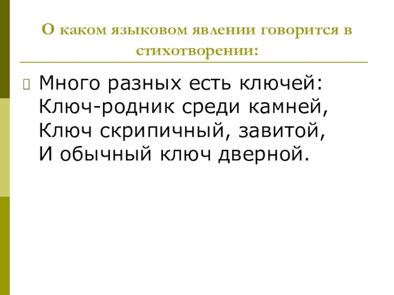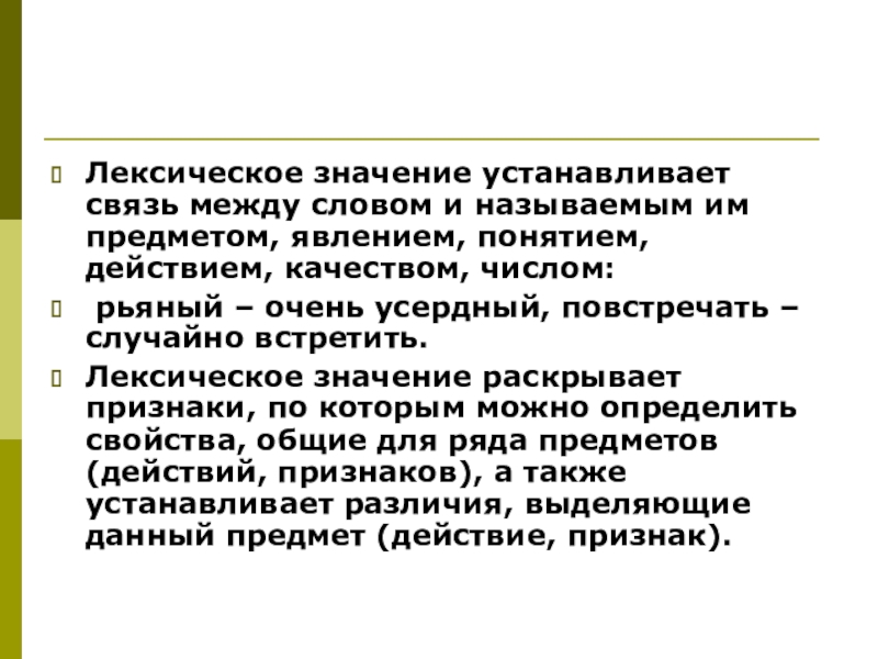 Лексическое значение раскрывает признаки, по которым можно определить свойства, общие для ряда предметов (действий, признаков), а также устанавливает различия, выделяющие данный предмет (действие, признак).