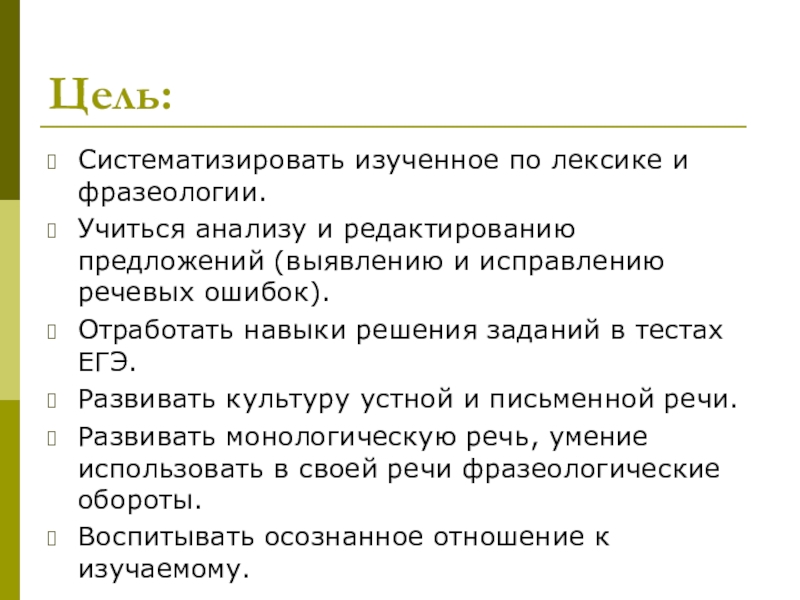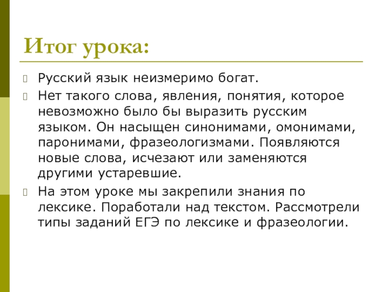 На этом уроке мы закрепили знания по лексике. Поработали над текстом. Рассмотрели типы заданий ЕГЭ по лексике и фразеологии.