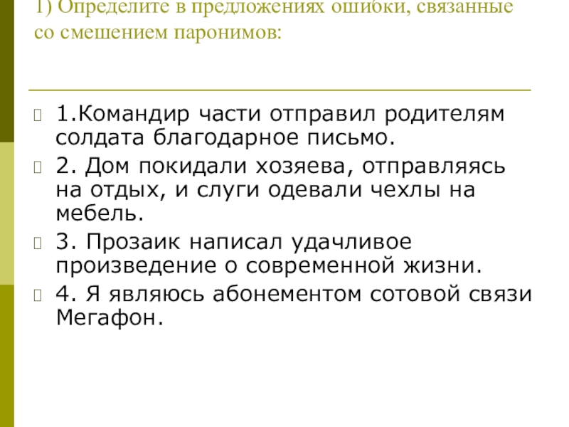 Слайд 101) Определите в предложениях ошибки, связанные со смешением паронимов: