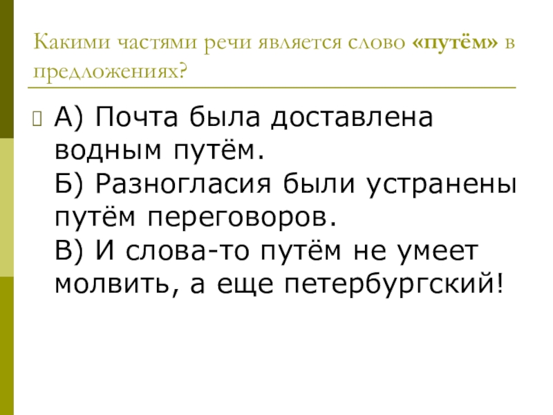 Слайд 14Какими частями речи является слово «путём» в предложениях?
