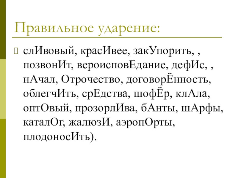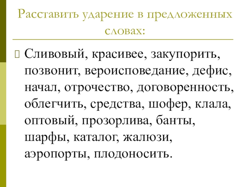 слИвовый, красИвее, закУпорить, ,позвонИт, вероисповЕдание, дефИс, ,нАчал, Отрочество, договорЁнность, облегчИть,