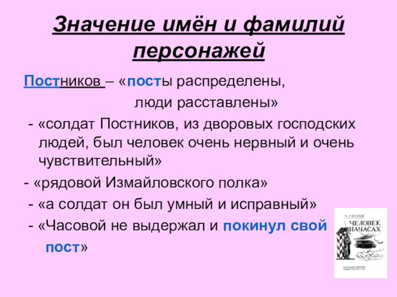 - «солдат Постников, из дворовых господских людей, был человек очень нервный и очень чувствительный»
