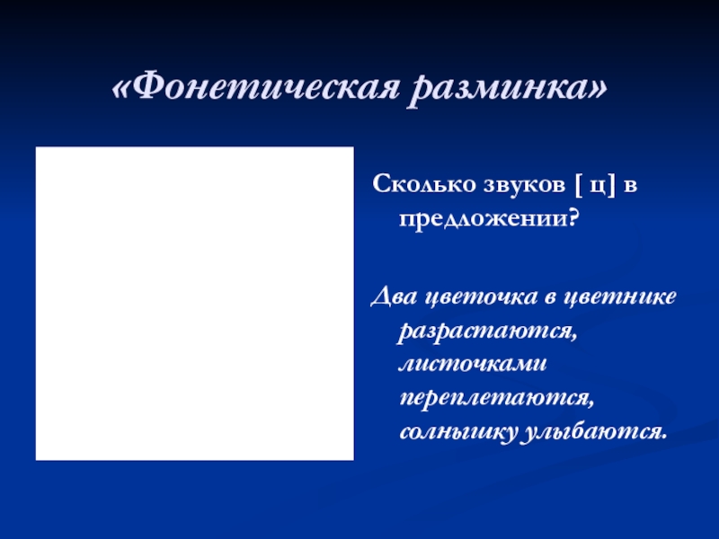 «Фонетическая разминка»Сколько звуков [ ц] в предложении?Два цветочка в цветнике разрастаются, листочками переплетаются, солнышку улыбаются.
