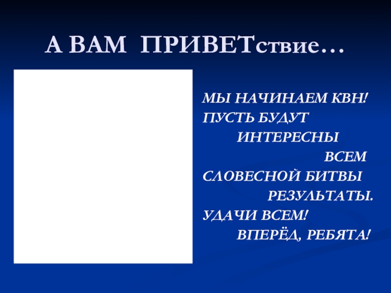 А ВАМ ПРИВЕТствие…МЫ НАЧИНАЕМ КВН!ПУСТЬ БУДУТ ИНТЕРЕСНЫ ВСЕМСЛОВЕСНОЙ БИТВЫ
