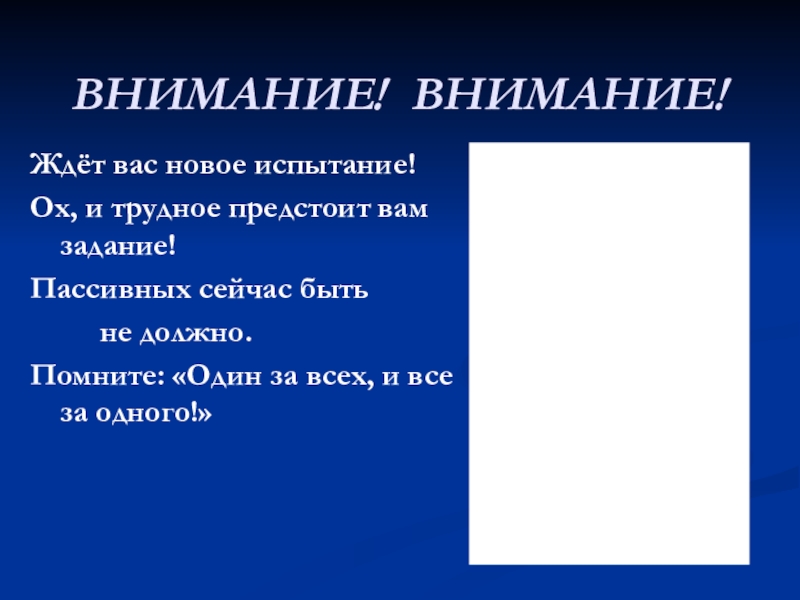 ВНИМАНИЕ! ВНИМАНИЕ!Ждёт вас новое испытание! Ох, и трудное предстоит вам задание!Пассивных сейчас быть