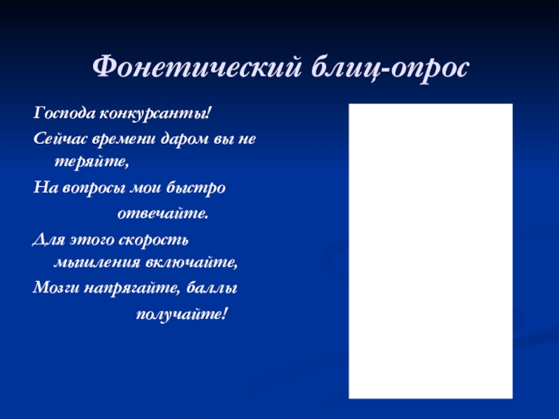 Фонетический блиц-опросГоспода конкурсанты!Сейчас времени даром вы не теряйте,На вопросы мои быстро