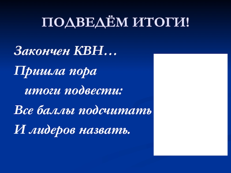 ПОДВЕДЁМ ИТОГИ!Закончен КВН…Пришла пора  итоги подвести:Все баллы подсчитатьИ лидеров назвать.