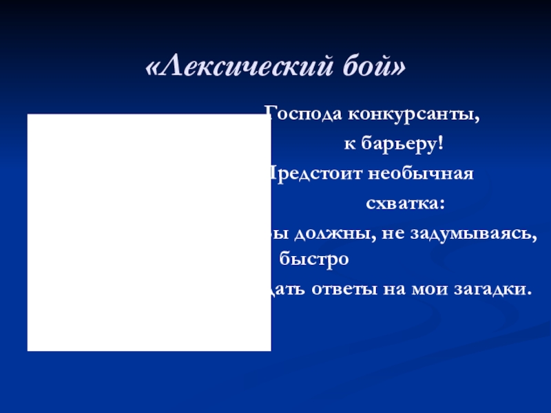 «Лексический бой» Господа конкурсанты,         к барьеру!Предстоит необычная