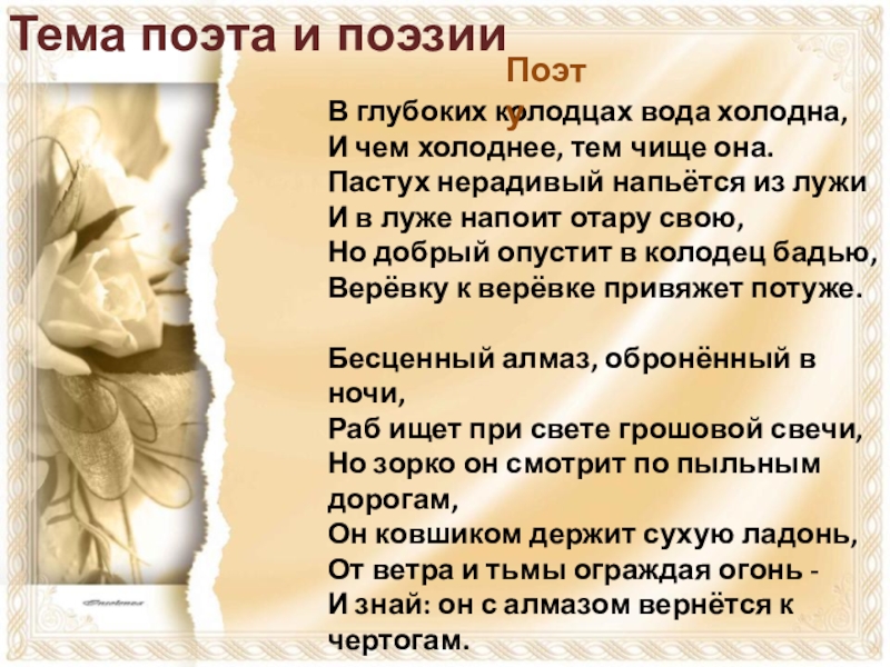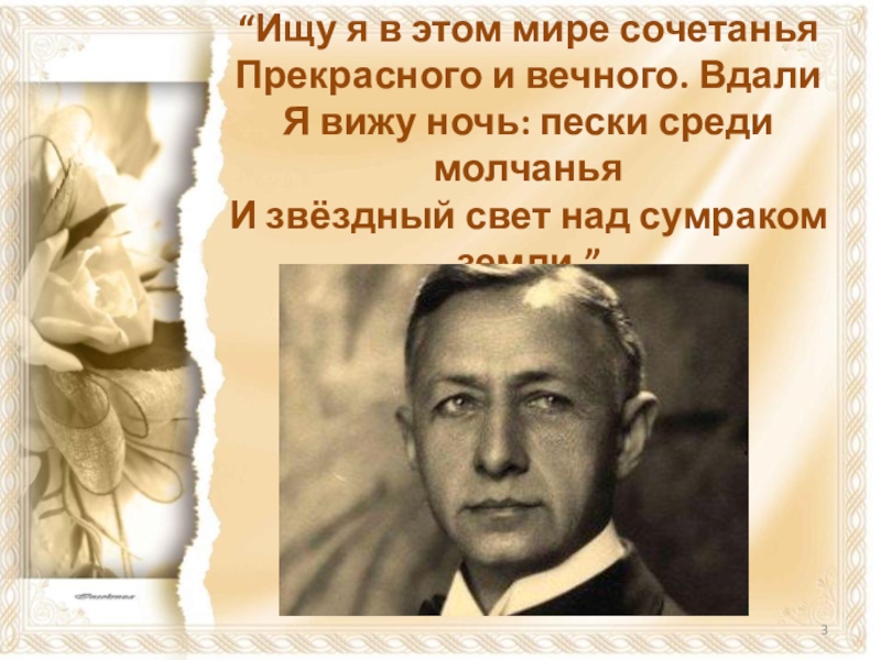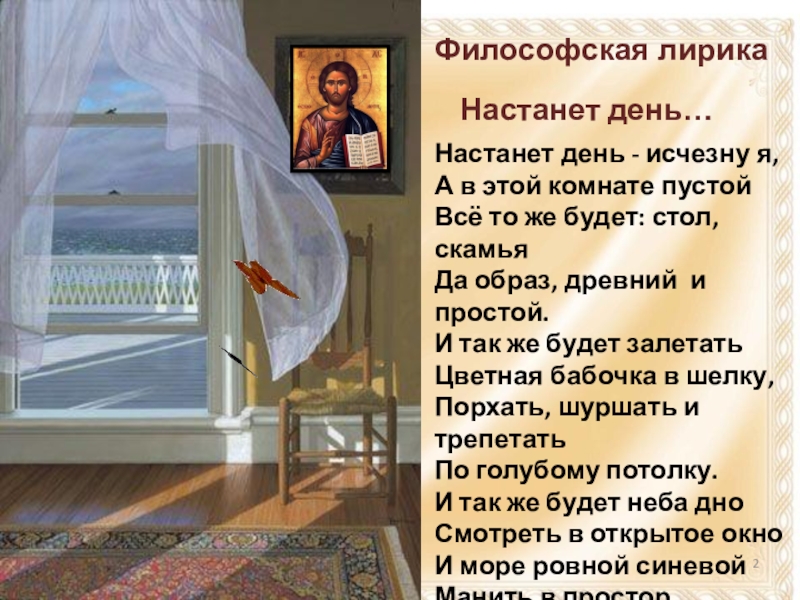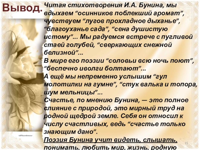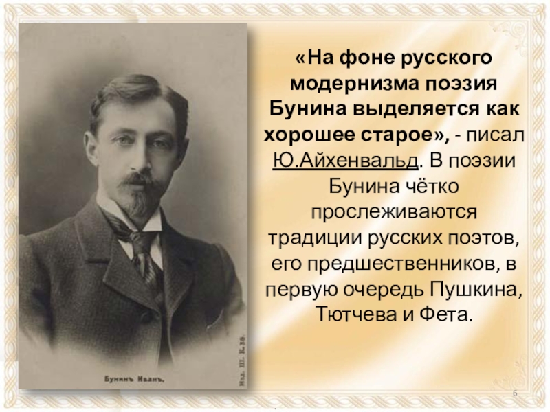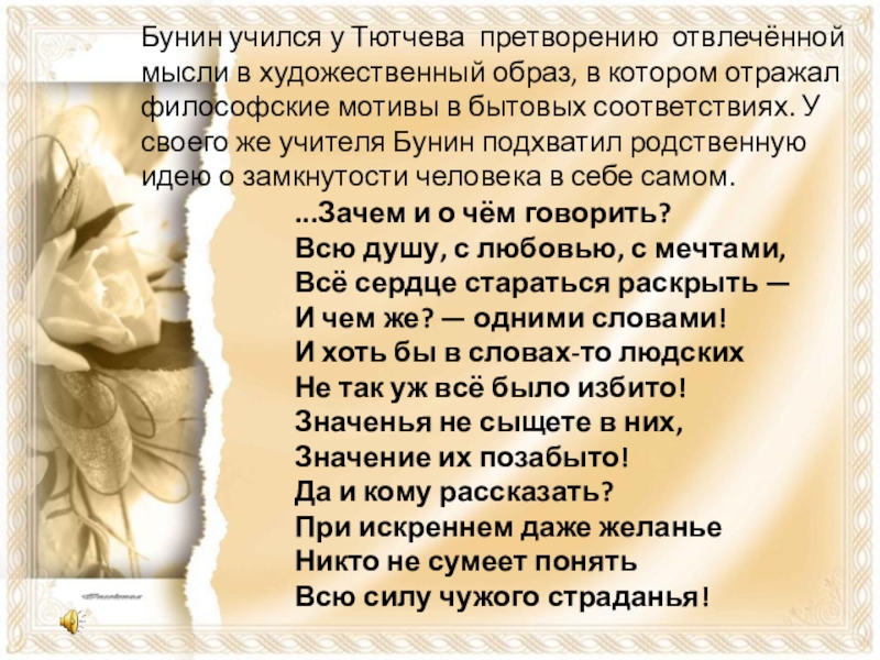 Бунин учился у Тютчева претворению отвлечённой мысли в художественный образ, в котором отражал философские мотивы в бытовых соответствиях. У своего же учителя Бунин подхватил родственную идею о замкнутости человека в себе самом.