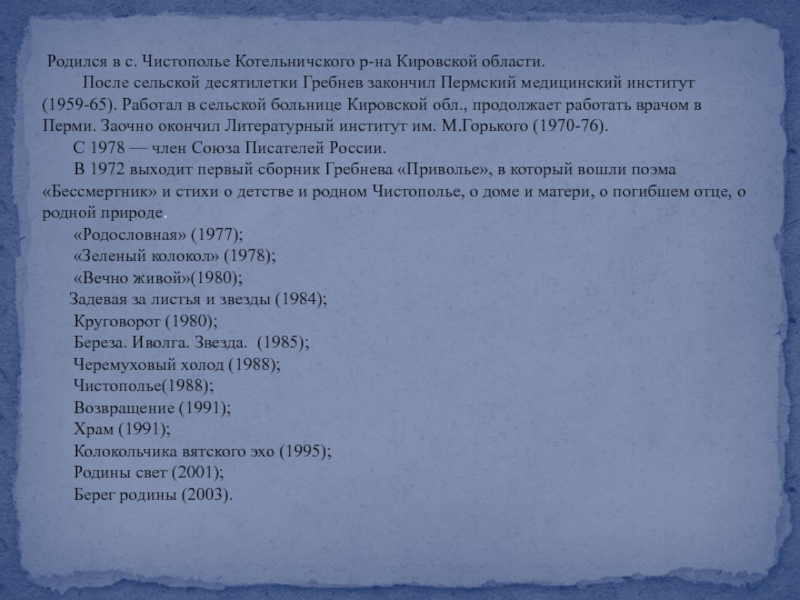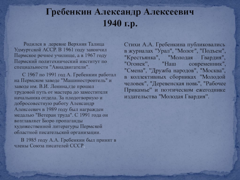 Стихи А.А. Гребенкина публиковались в журналах "Урал", "Молот", "Подъем", "Крестьянка", "Молодая Гвардия", "Огонек", "Наш современник", "Смена", "Дружба народов", "Москва", в коллективных сборниках "Молодой человек", "Деревенская новь", "Рабочее Прикамье" и поэтическом ежегоднике издательства "Молодая Гвардия".