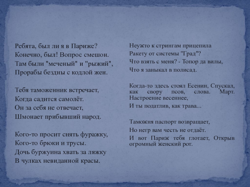 И вот Париж тебя глотает, Открыв огромный женский рот.