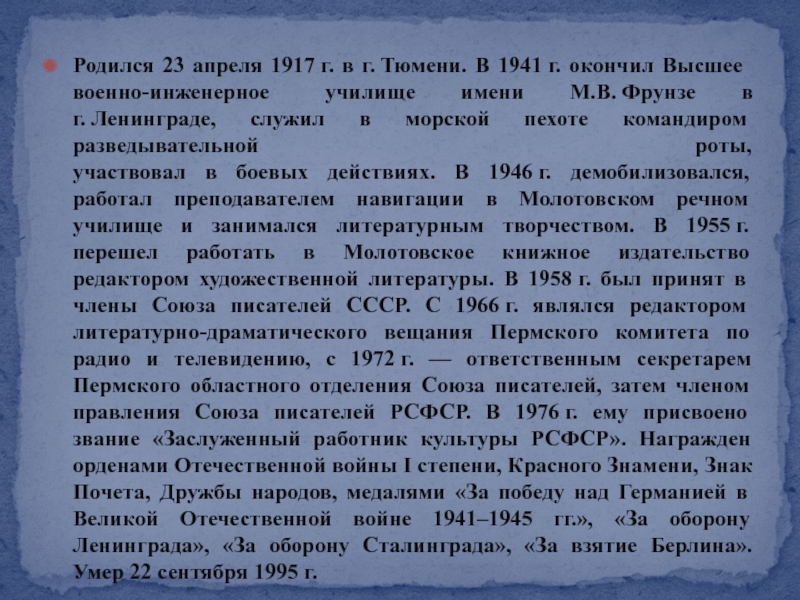 Родился в 1955 году в городе Веймар, ГДР. С 1958-го живет в Перми. Окончил Пермский политехнический институт (1981). Член Союза писателей (1992). Лауреат областной премии в сфере культуры и искусства (2001). Дипломант журналистского конкурса им. Аркадия Гайдара (2006, 2007).