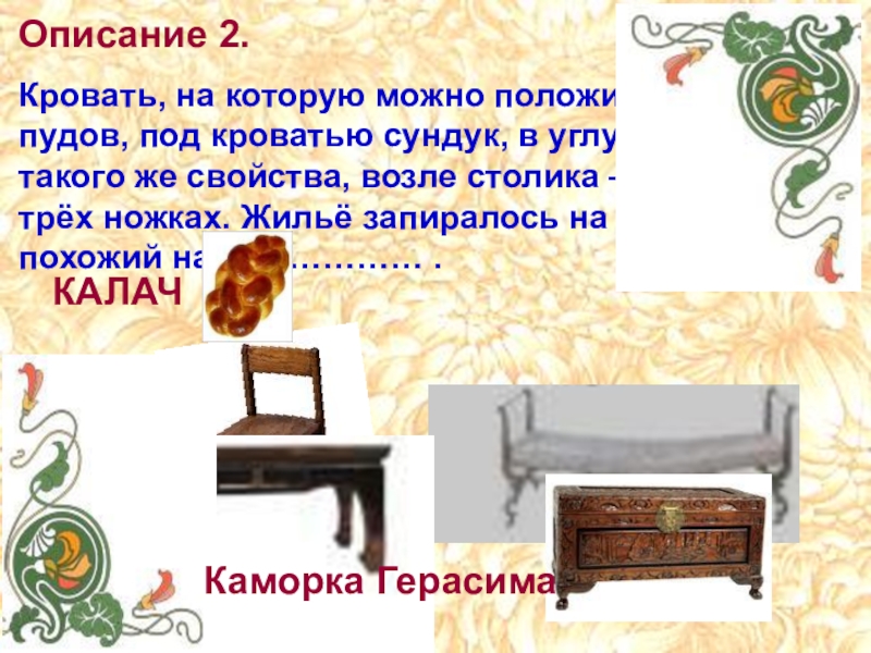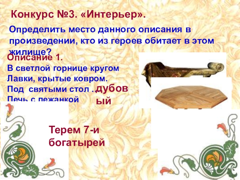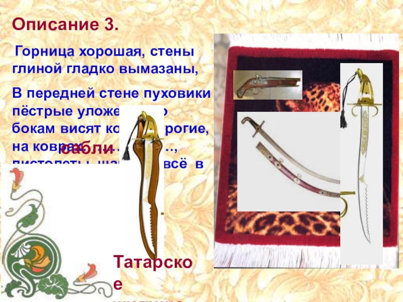 Описание 1. В светлой горнице кругом Лавки, крытые ковром. Под святыми стол … Печь с лежанкой изразцовой.