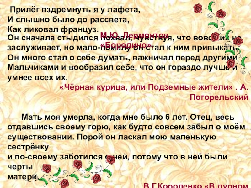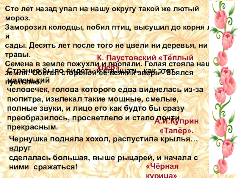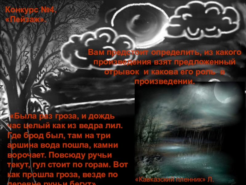«Была раз гроза, и дождь час целый как из ведра лил. Где брод был, там на три аршина вода пошла, камни ворочает. Повсюду ручьи текут, гул стоит по горам. Вот как прошла гроза, везде по деревне ручьи бегут».