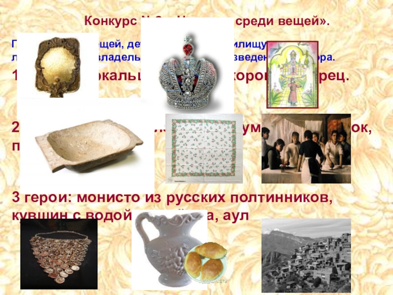 3 герой: монисто из русских полтинников, кувшин с водой и лепёшка, аул