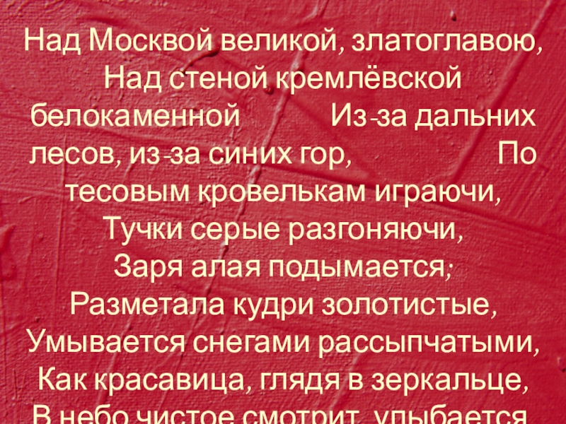 Над стеной кремлёвской белокаменной Из-за дальних лесов, из-за синих гор, По тесовым кровелькам играючи, Тучки серые разгоняючи, Заря алая подымается; Разметала кудри золотистые, Умывается снегами рассыпчатыми, Как красавица, глядя в зеркальце, В небо чистое смотрит, улыбается.