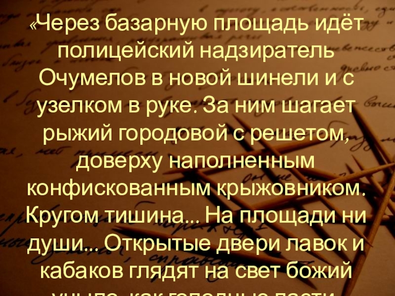 Слайд 8«Через базарную площадь идёт полицейский надзиратель Очумелов в новой шинели и
