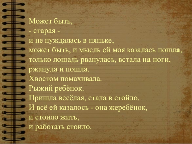 - старая - и не нуждалась в няньке, может быть, и мысль ей моя казалась пошла, только лошадь рванулась, встала на ноги, ржанула и пошла. Хвостом помахивала. Рыжий ребёнок. Пришла весёлая, стала в стойло. И всё ей казалось - она жеребёнок, и стоило жить, и работать стоило.