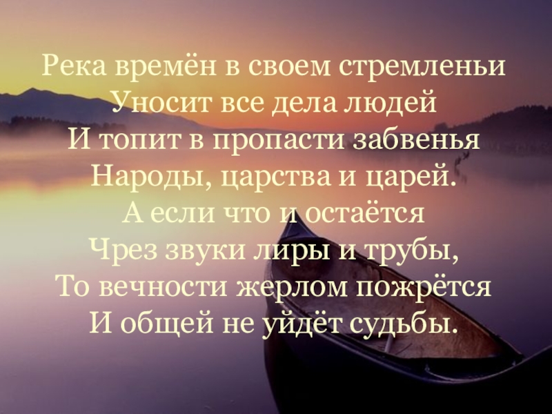 Уносит все дела людей И топит в пропасти забвенья Народы, царства и царей. А если что и остаётся Чрез звуки лиры и трубы, То вечности жерлом пожрётся И общей не уйдёт судьбы.