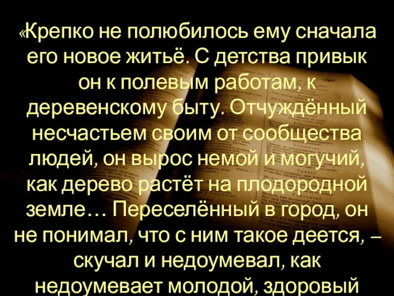 он к полевым работам, к деревенскому быту. Отчуждённый несчастьем своим от сообщества людей, он вырос немой и могучий, как дерево растёт на плодородной земле… Переселённый в город, он не понимал, что с ним такое деется, – скучал и недоумевал, как недоумевает молодой, здоровый бык, которого только что взяли с нивы…»
