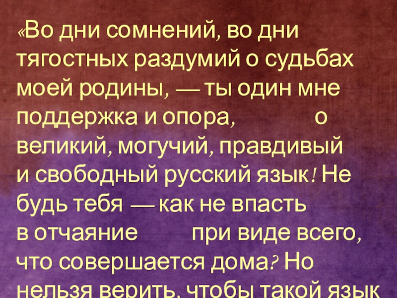 ты один мне поддержка и опора, о великий, могучий, правдивый и свободный русский язык! Не будь тебя — как не впасть в отчаяние при виде всего, что совершается дома? Но нельзя верить, чтобы такой язык не был дан великому народу!»