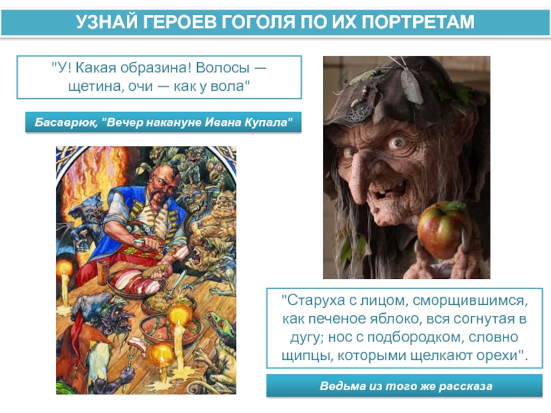 "Старуха с лицом, сморщившимся, как печеное яблоко, вся согнутая в дугу; нос с подбородком, словно щипцы, которыми щелкают орехи".