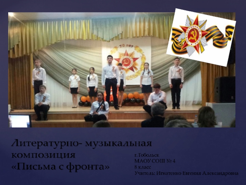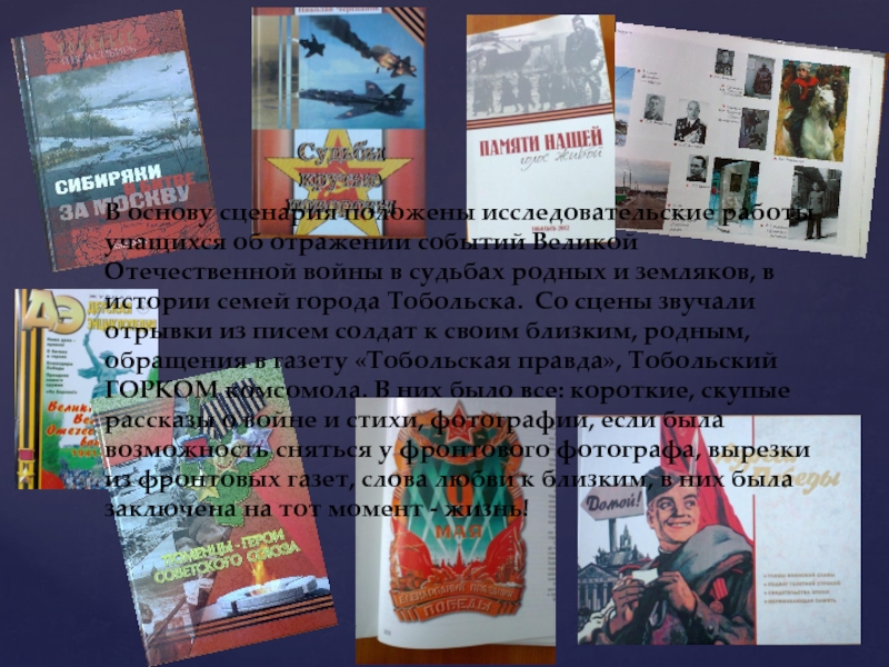 Отечественной войны в судьбах родных и земляков, в истории семей города Тобольска. Со сцены звучали отрывки из писем солдат к своим близким, родным, обращения в газету «Тобольская правда», Тобольский ГОРКОМ комсомола. В них было все: короткие, скупые рассказы о войне и стихи, фотографии, если была возможность сняться у фронтового фотографа, вырезки из фронтовых газет, слова любви к близким, в них была заключена на тот момент - жизнь!