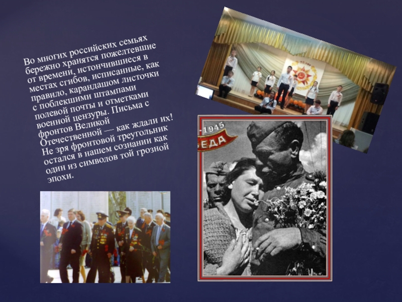 Слайд 13Солдатские письма… Пожелтевшие от времени треугольники со штемпелями полевой почты… Каким спасением были