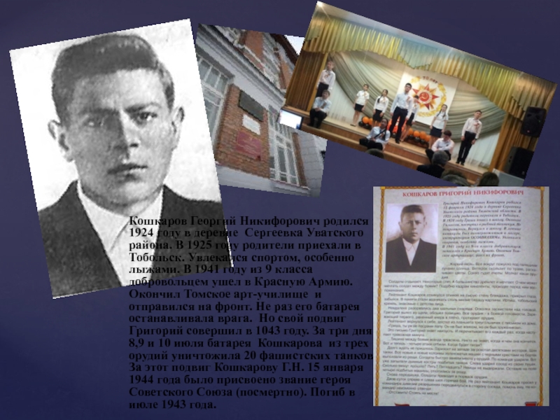 района. В 1925 году родители приехали в Тобольск. Увлекался спортом, особенно лыжами. В 1941 году из 9 класса добровольцем ушел в Красную Армию. Окончил Томское арт-училище и отправился на фронт. Не раз его батарея останавливала врага. Но свой подвиг Григорий совершил в 1043 году. За три дня 8,9 и 10 июля батарея Кошкарова из трех орудий уничтожила 20 фашистских танков. За этот подвиг Кошкарову Г.Н. 15 января 1944 года было присвоено звание героя Советского Союза (посмертно). Погиб в июле 1943 года.
