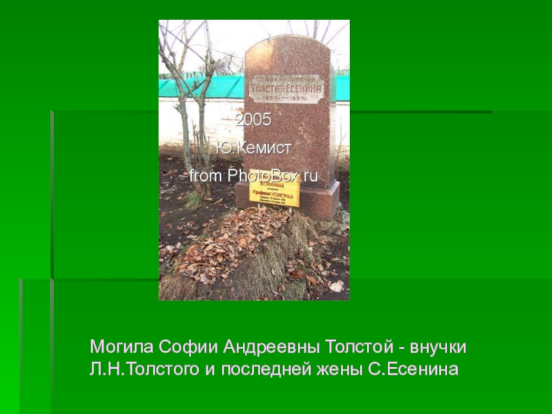 Слайд 44Могила Софии Андреевны Толстой - внучки Л.Н.Толстого и последней жены С.Есенина