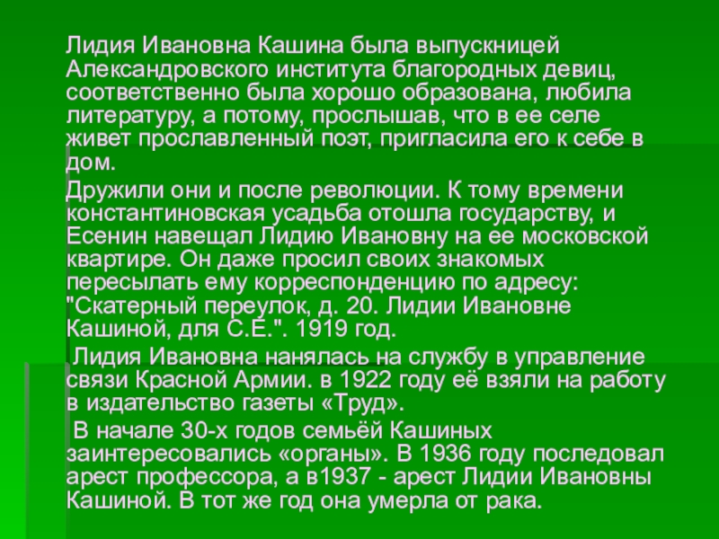 Слайд 11Лидия Ивановна Кашина была выпускницей Александровского института благородных девиц, соответственно была