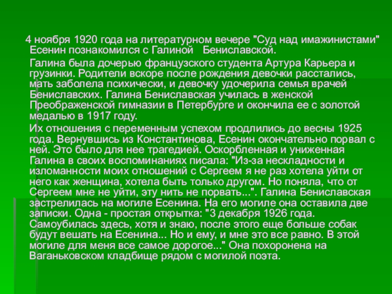 Любовь ее к Есенину была нелегкой. Эта женщина редкого ума и широкого сердца внесла в тревожную кочевую жизнь Сергея Есенина свет и успокоение. Но, видимо, было уже поздно. В конце декабря Есенин сбежал из Москвы в Ленинград, не сказав ни слова ни жене, ни друзьям.
