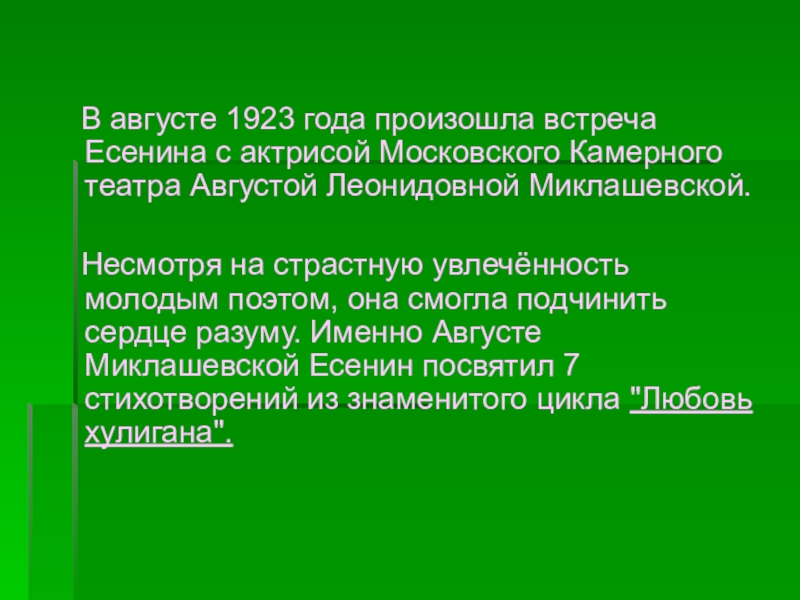 Несмотря на страстную увлечённость молодым поэтом, она смогла подчинить сердце разуму. Именно Августе Миклашевской Есенин посвятил 7 стихотворений из знаменитого цикла "Любовь хулигана".