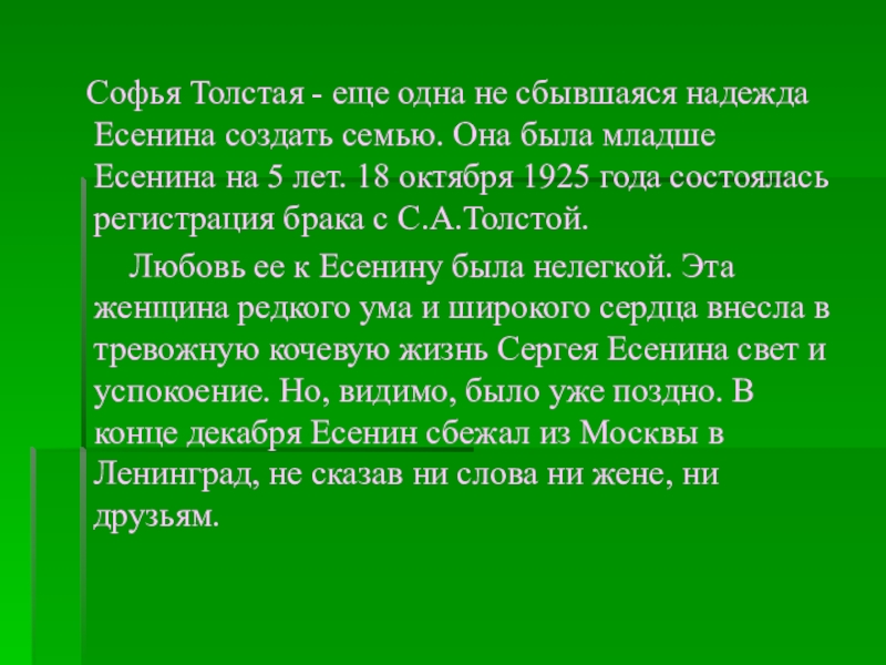 создать семью. Она была младше Есенина на 5 лет. 18 октября 1925 года состоялась регистрация брака с С.А.Толстой.